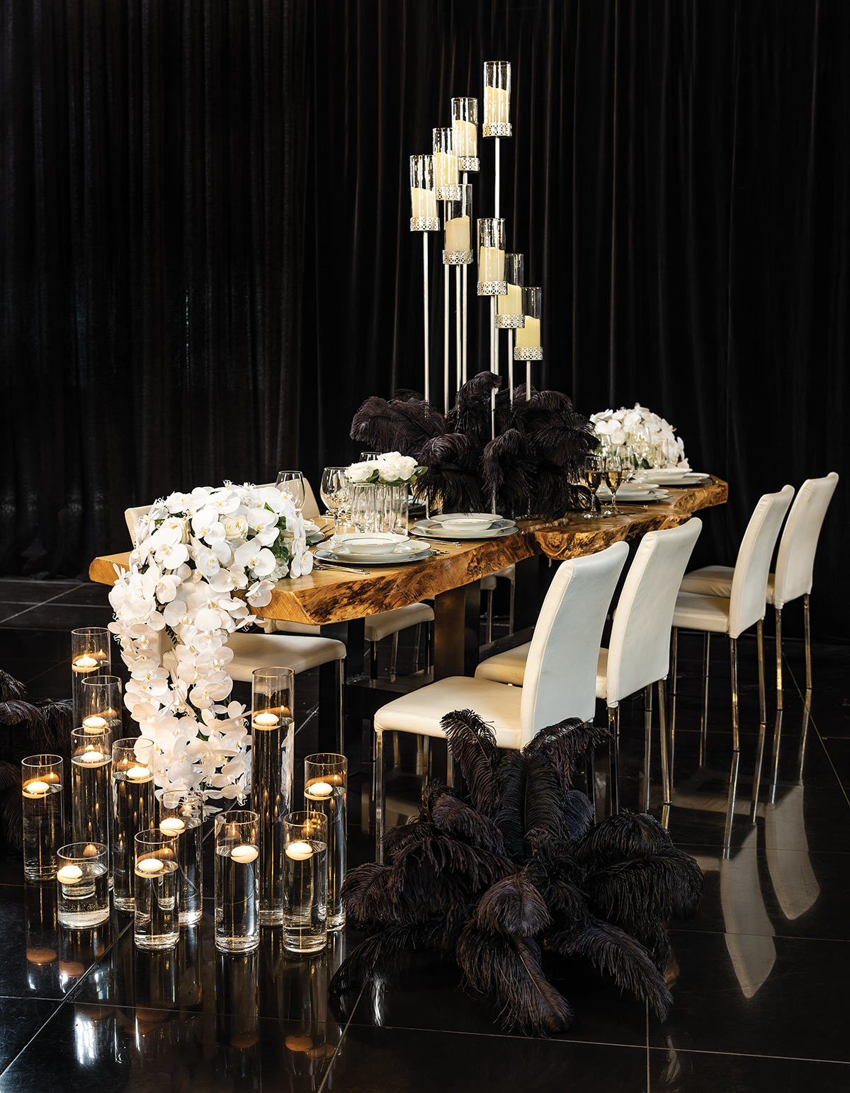 Dramatic black wedding decor can create a bold and sophisticated atmosphere, adding a touch of elegance and modernity to the celebration. Here are some ideas for incorporating dramatic black elements into various aspects of wedding decor: